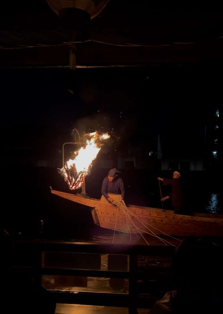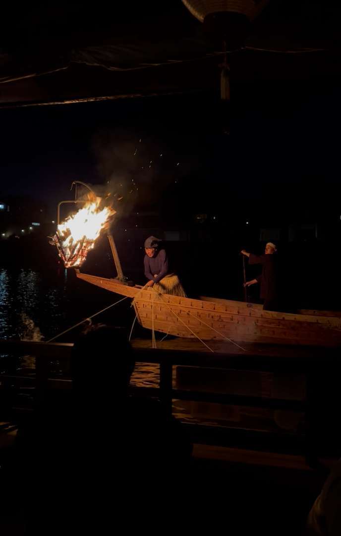 開始を知らせる打ち上げ花火の後、今年も、炎の熱さが伝わるほど近くで鵜飼を見ることができました😉